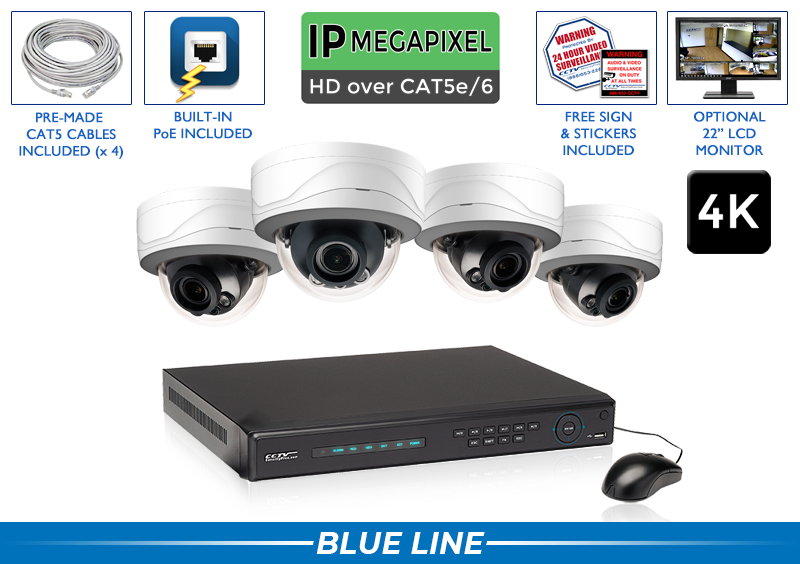 - (4) IP 8MP Indoor/Outdoor Vandal Resistant Infrared Dome Security Cameras with 2.7 to 13.5mm Motorized Zoom Lens and up to 130ft Night Vision
